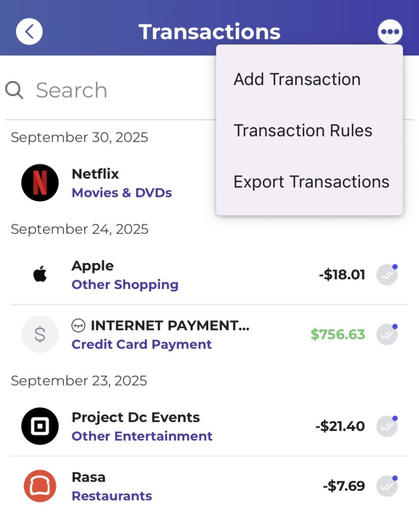 - To begin, navigate to the Transactions page. From here tap the three dot action menu at the top right of the screen. Next, enter the details of your manual transaction such as if it’s a debit or credit, the merchant name, category, and description. Once you’ve finish be sure to tap Create Transaction before exiting.